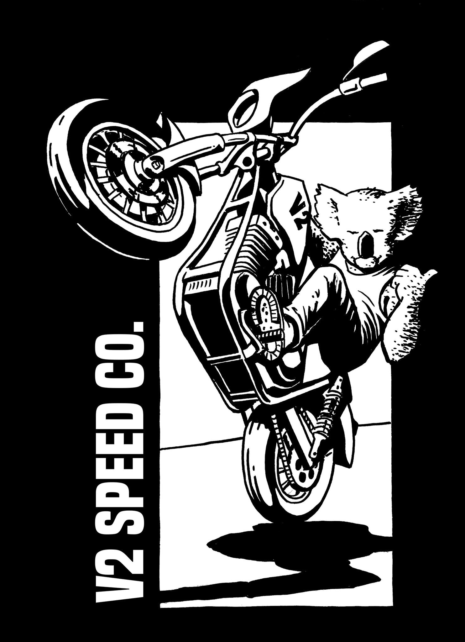 V2 Speed Co Koala Wheelie Design on back, logo on front, top left.